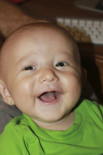 This little man has just captured our hearts. Even Chandler and Ben are putty in Danny's slobbery little hands. He's such a happy kid and all it takes is him chewing on my face to brighten my day. He has discovered his hands and also gets very curious when he sees someone eating or drinking near him.